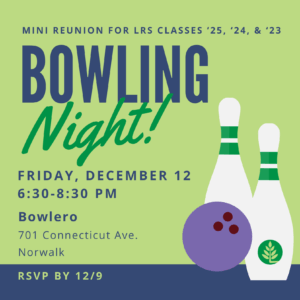 Mini Reunion for LRS Classes of '23, '24 and '25 Bowling is scheduled for December 12 at 6:30 p.m. at Bowlero, 701 Connecticut Avenue, Norwalk, CT. RSVP by 12/9/24. This is a drop-off event. Dinner will be served.